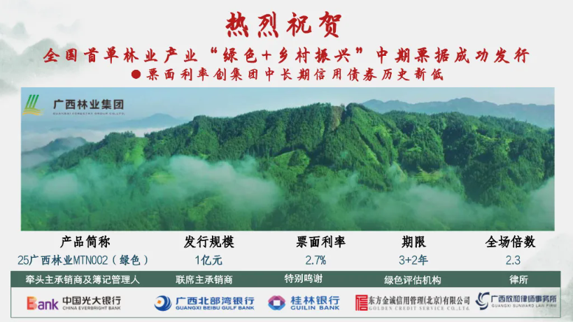 2025年8月4日,廣林集團(tuán)成功發(fā)行全國首單林業(yè)產(chǎn)業(yè)“綠色+鄉(xiāng)村振興”中期票據(jù),債券發(fā)行規(guī)模1億元,期限3+2年,票面利率2.7%,創(chuàng)公司中長期債券發(fā)行利率歷史新低,為廣西林業(yè)綠色高質(zhì)量發(fā)展提供資金支撐開辟新渠道,添加新動能。